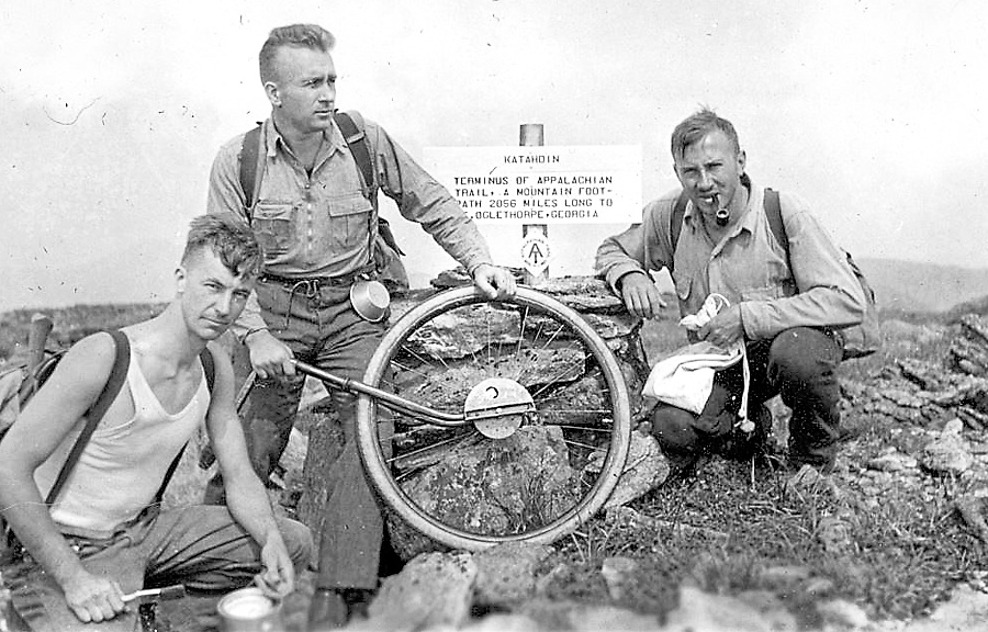 In this photograph, taken Aug. 19, 1933, as it appeared in the book “Along Maine’s Appalachian Trail” by trail historian and Maine Appalachian Trail Club member Dave Field of Hampden, are (from left) Albert H. Jackman with paint can, Myron H. Avery holding a wheel for measuring distance and J. Frank Schairer, who pose in front of the original AT summit sign on Baxter Peak.