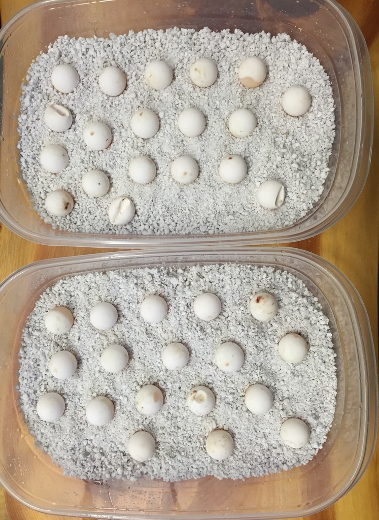 At the clinic, Rivers has buried the eggs, which are slightly larger than golf balls, in two containers filled with a hatching medium, a gravel-like material made specifically for incubating turtle eggs. There they’ll remain for about three months, with Rivers adding water to the containers on a regular basis to simulate rain and create the humid environment they need to hatch in the fall.