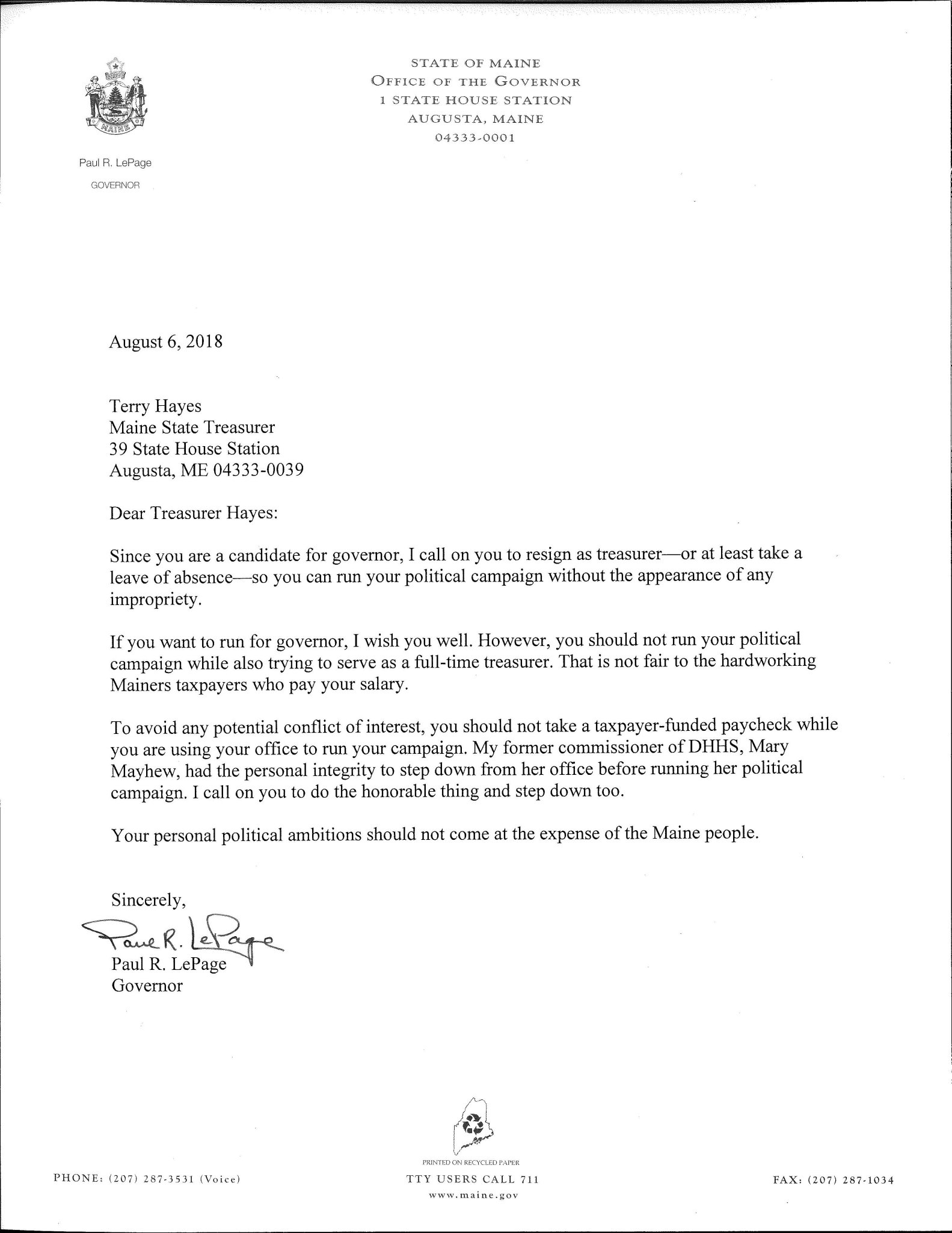 As he recently pledged to do at a private fundraiser, Gov. Paul LePage has asked Attorney General Janet Mills to give up her government job because she is running for governor. He asked the same of State Treasurer Terry Hayes, who is also running for governor.