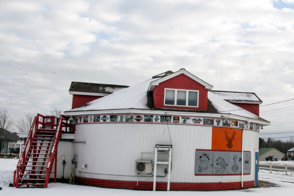 None of its goofy history is readily apparent from a glance at building, whose latest owner, Central Maine Harley-Davidson, moved in about four years ago. Previous owners have added a second floor, peaked roof and windows, and a small, boxy addition on the east side of its ground floor since the specialty-cheese store closed in the 1980s. It is now shingled and painted red, all of this effectively masking much of the building’s rounded shape and cheesy history.