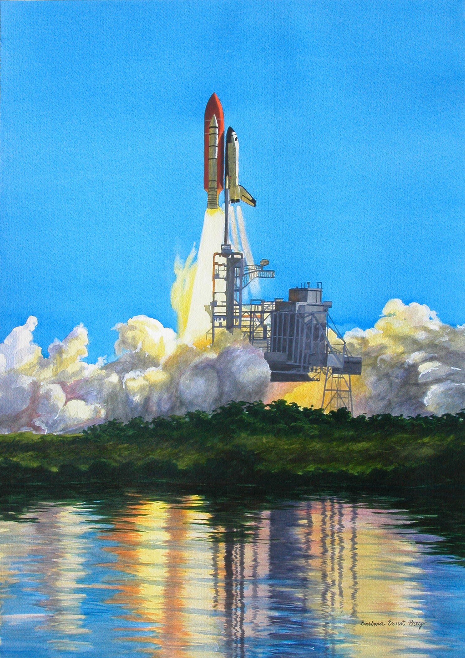 In the Columbia tribute painting, Prey utilized her bright blues, anchoring the shuttle as it takes off surrounded by smoke and flames into the sky above the Kennedy Space Center in Cape Canaveral, Florida.