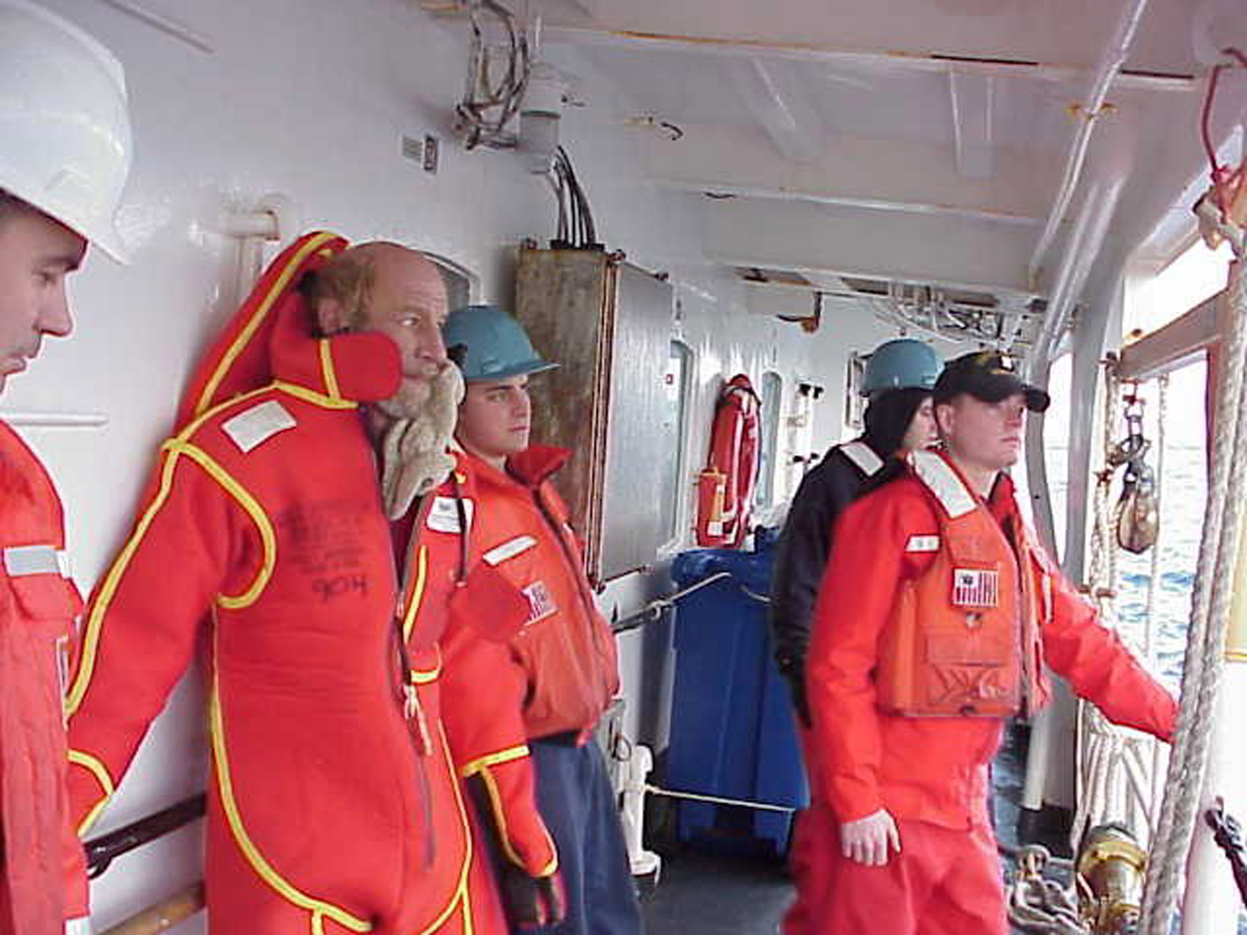 A boater., left in a bright red safety suit, stands with crew members of the U.S. Coast Guard cutter Reliance watching them secure his sailboat for towing in this 2002 file photo. Credit: Courtesy of the U.S. Coast Guard