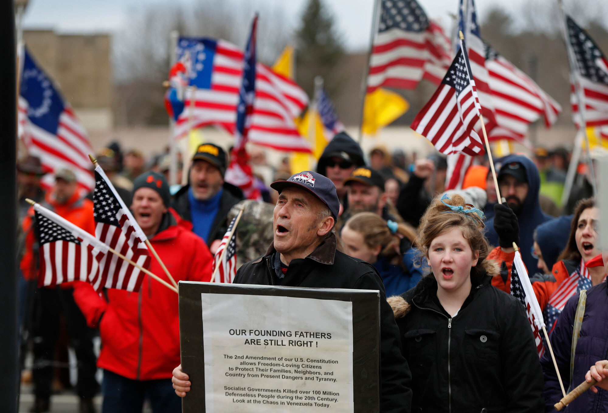 Maine gun rights supporters cheer at a rally, Saturday, April 14, 2018, at the State House in Augusta, Maine. Credit: Robert F. Bukaty / AP