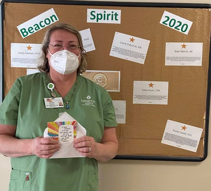 This award is Amedisys’ highest clinical honor, recognizing the heroic work that’s been on display throughout this most unprecedented time for those in healthcare. Established in 2004, “The Spirit of Excellence Award honors clinicians who have provided the highest level of service, while demonstrating the tenets of the Amedisys SPIRIT,” says Beacon Hospice’s Executive Director Kristy Thibodeau. “SPIRIT stands for Service, Passion, Integrity, Respect, Innovation and Talent, which truly defines Laura.”