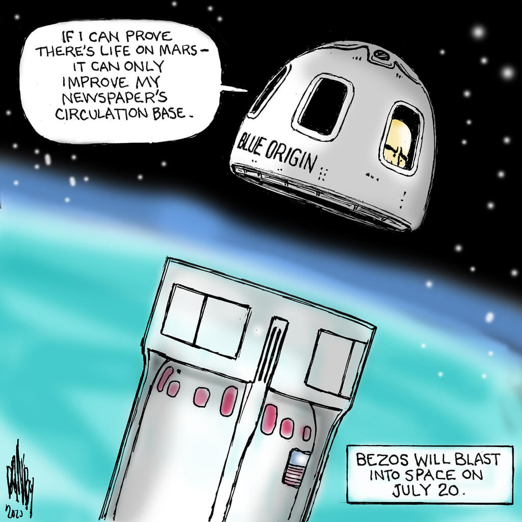 Bezos will step down as Amazon’s CEO 15 days before liftoff. He announced months ago that he wants to spend more time on his rocket company as well as his newspaper, The Washington Post.
