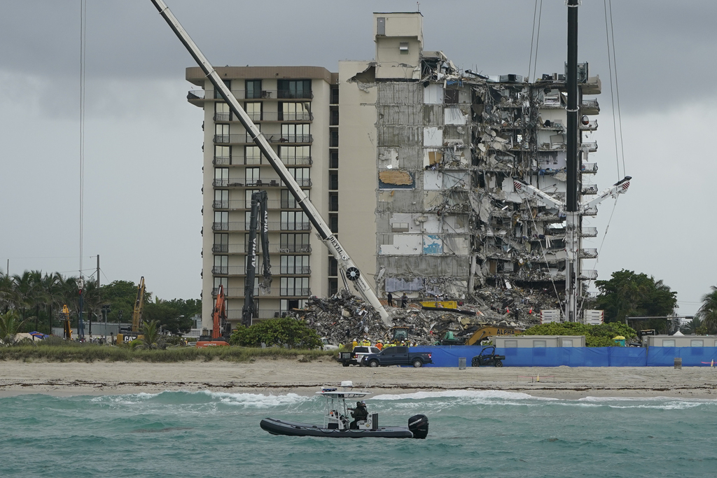 A Florida Fish and Wildlife Conservation law enforcement boat patrols in the ocean in front of search and rescue efforts at the Champlain Towers South condo building, where around 150 people remain missing after it partially collapsed in Surfside, Florida. Credit: Lynne Sladky / AP