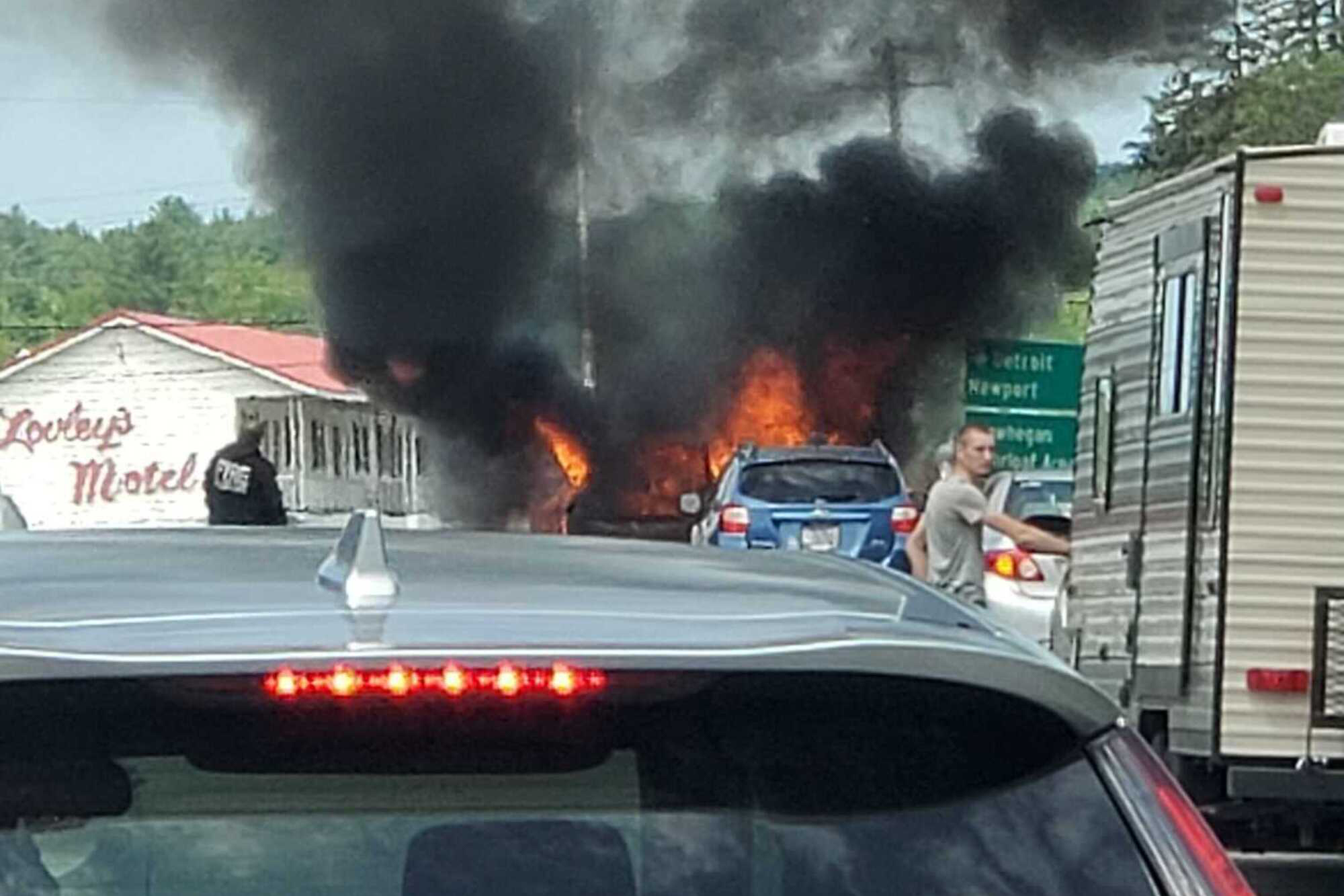 A car engulfed in flames shut down traffic on the Newport exit to I-95 on Monday, Maine Department of Public Safety spokesperson Shannon Moss said.