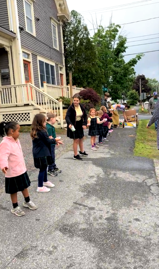 BRUNSWICK — On the morning of June 6, the entire student body at St. John’s Catholic School in Brunswick stood stand side by side and formed a line stretching from the school to the Mid Coast Hunger Prevention Program. One by one, hundreds of donated items from the school community, totaling over 500 pounds, were handed from student to student to the facility where they will provide help and comfort to many community members in need. To watch a video of the “human chain,” visit www.facebook.com/watch/sjcsbme.