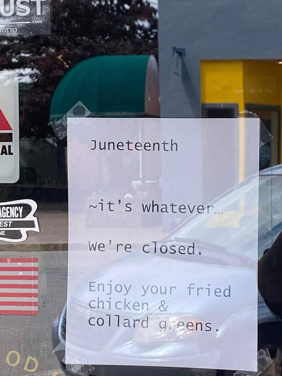 The closed sign on the door of the Harry E. Reed Insurance Agency read: “Juneteenth ~it’s whatever… We’re closed. Enjoy your fried chicken and collard greens.”