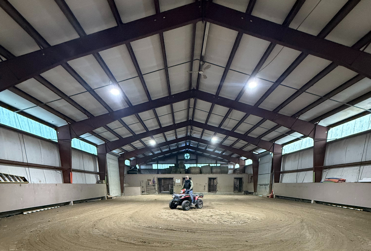 The property features a sizable indoor arena, an eight-stall barn and another small barn. The indoor arena has been tilled up with new footings and sand, new lights have been installed, stalls redone and ground broken for a new outdoor arena.